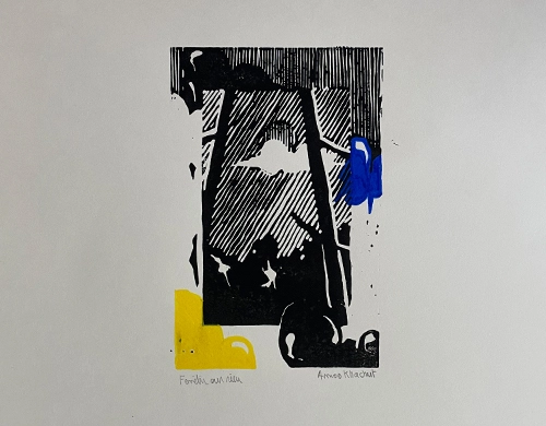 Description : la linogravure est une technique de gravure en relief appelée taille d’épargne. Ce qui reste sur la plaque sera imprimé contrairement à la gravure taille douce ou en creux. L’impression de la plaque de linoléum ou vinyle se fait via la pression exercée à l’aide d’une cuillère à soupe (le dos) ou d’un baren.