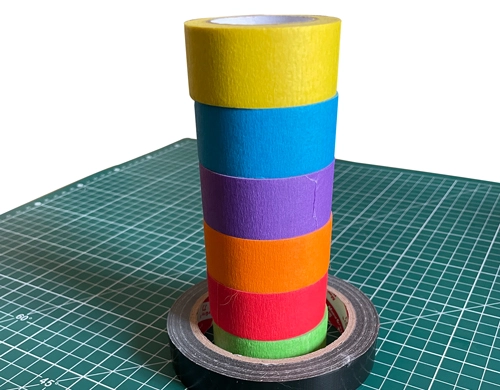 Matériel : cutter, bandes autocollantes et gommettes rondes colorées.